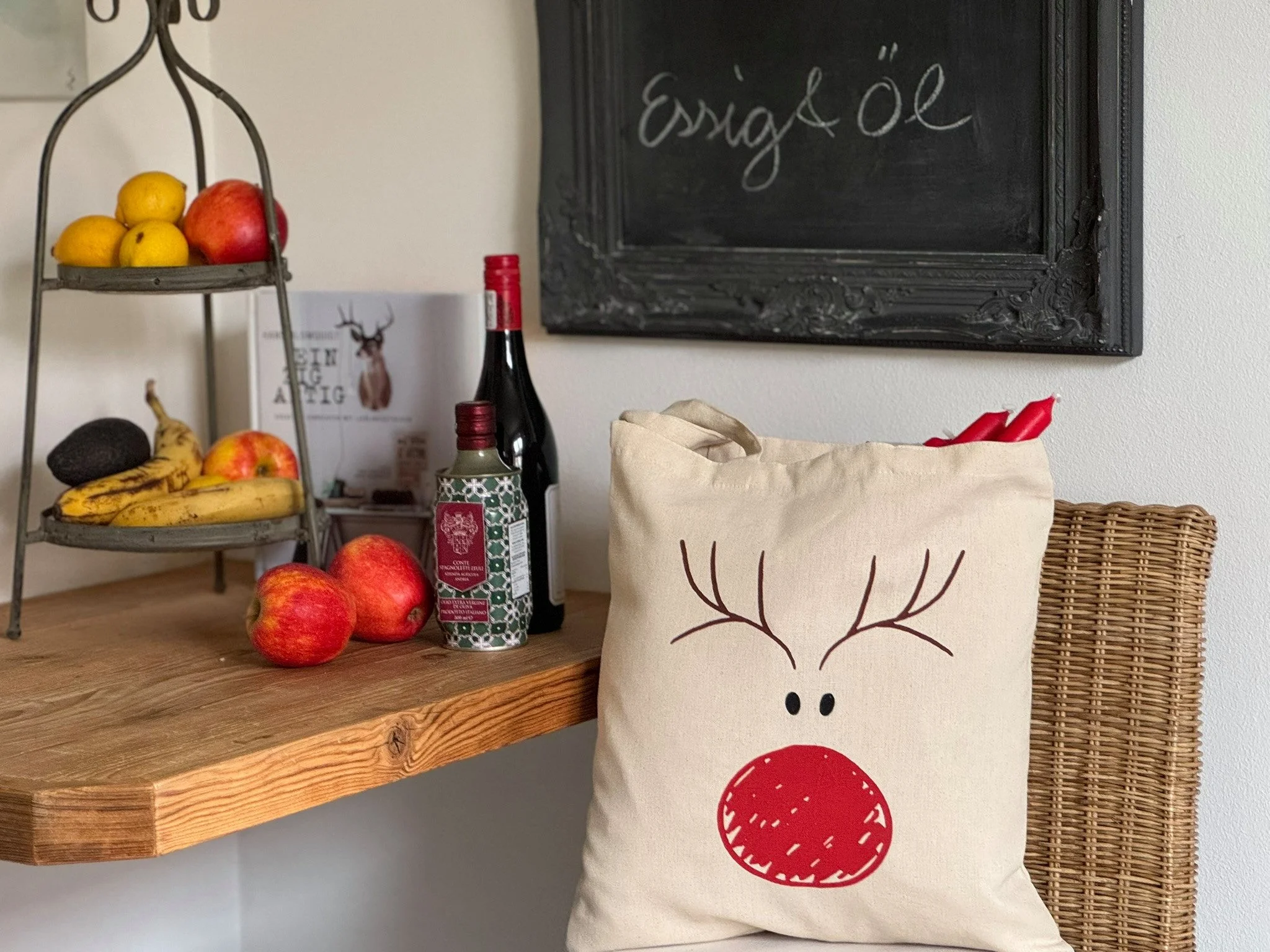 Highlights: Nachhaltige Baumwolltasche, festliches Rentierdesign, ideal als Geschenktasche oder Einkaufstasche, dekorativ in der Adventszeit, langlebig und wiederverwendbar.