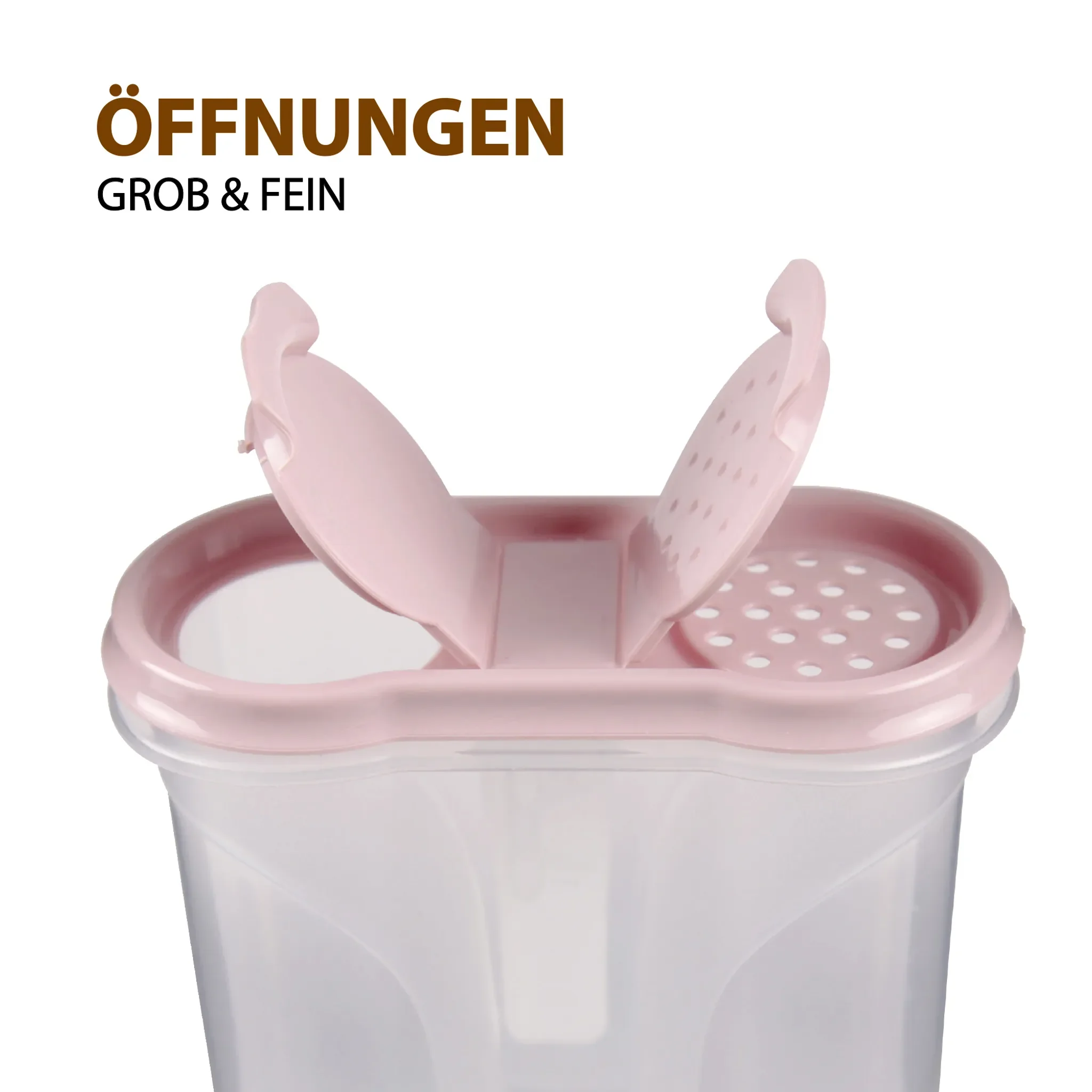Praktische Vorratsdose mit zwei Dosieröffnungen – ideal für Gewürze, Nüsse, Reis, Zucker oder Snacks