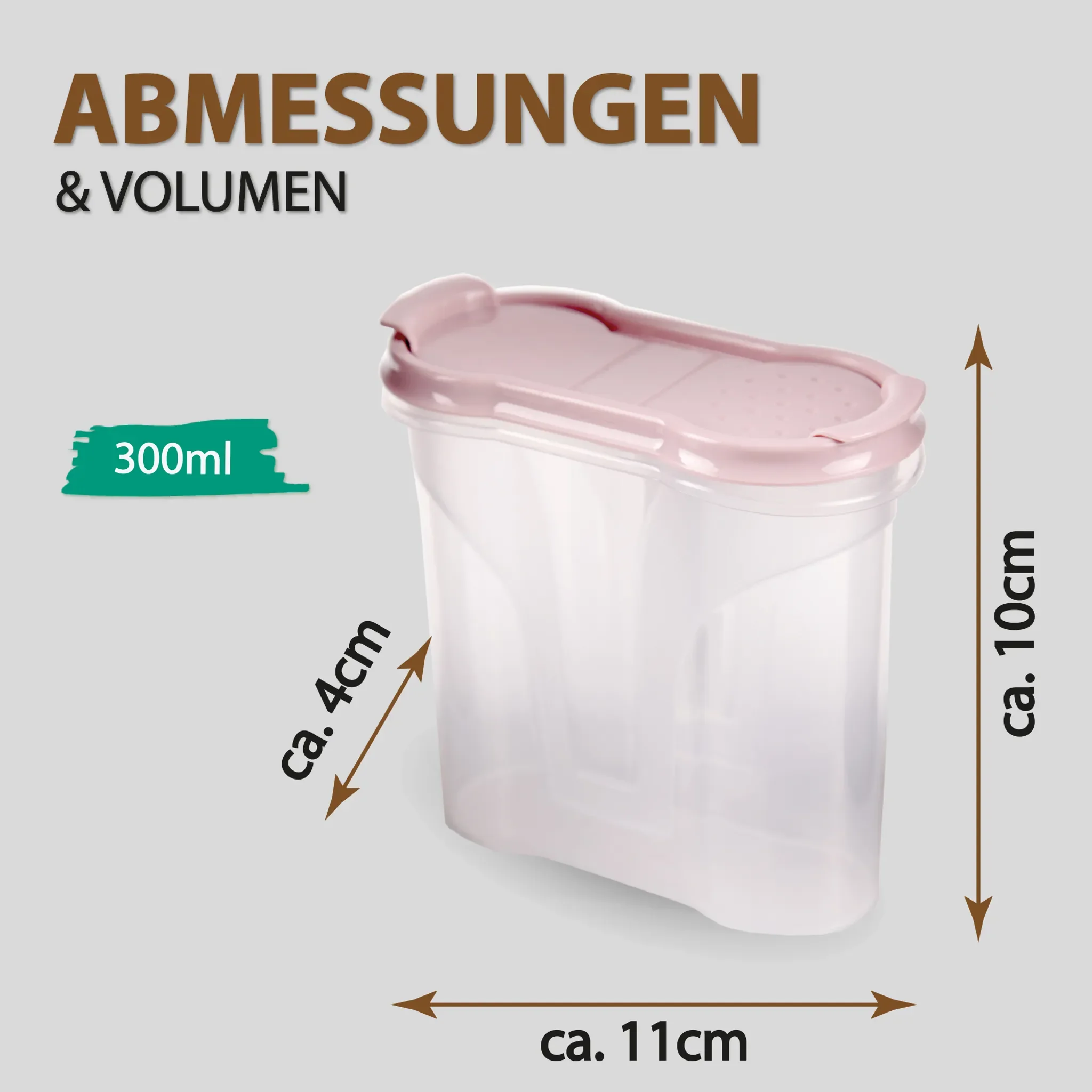 Der zweifache Ausgießer erlaubt präzises Dosieren: eine größere Öffnung zum Ausschütten und eine kleinere zum Streuen – ideal für Gewürze, Zucker, Kräuter oder feine Körner. Durch das transparente Design sehen Sie sofort, was sich in der Dose befindet und wann Nachschub nötig ist.
