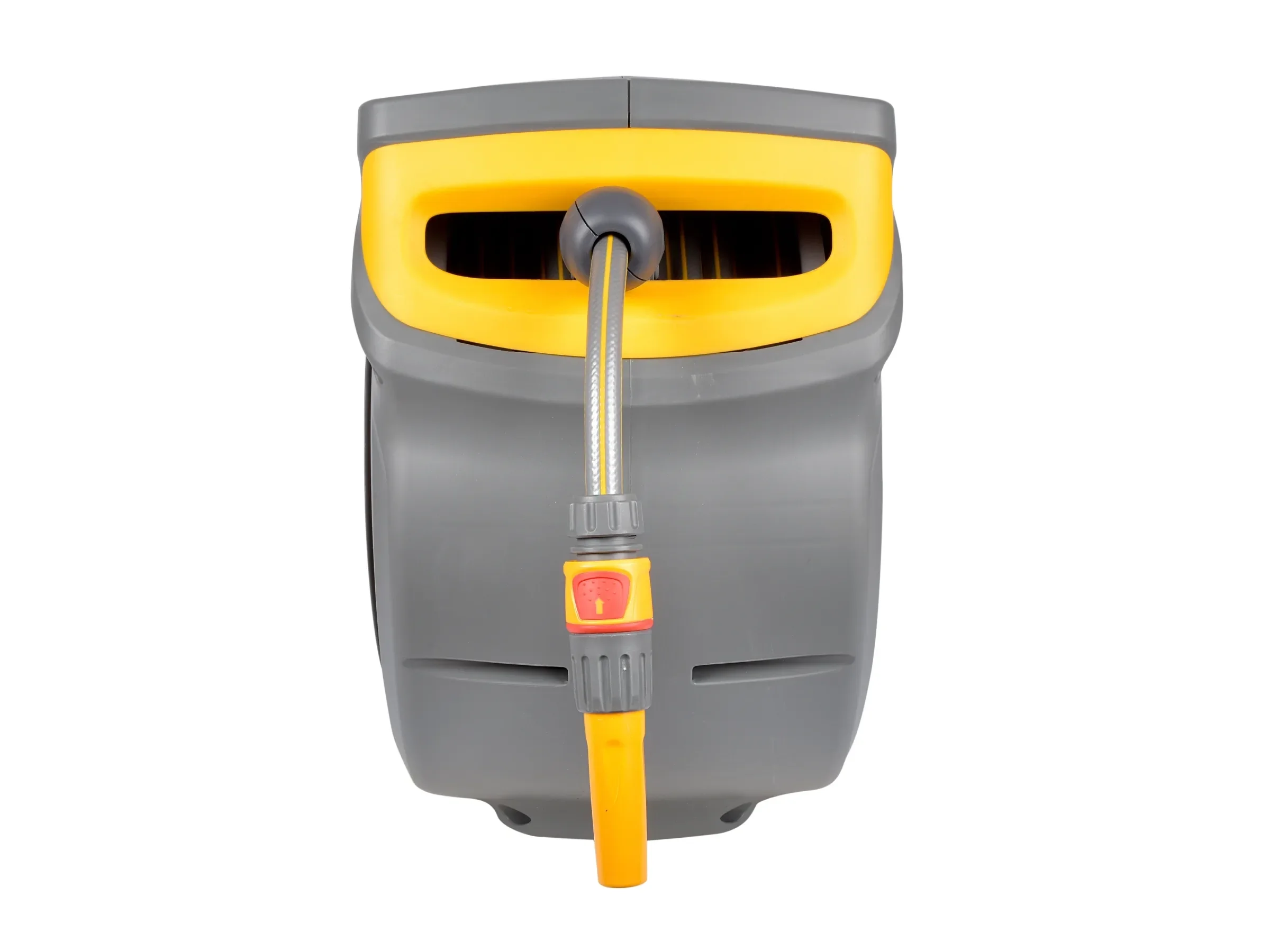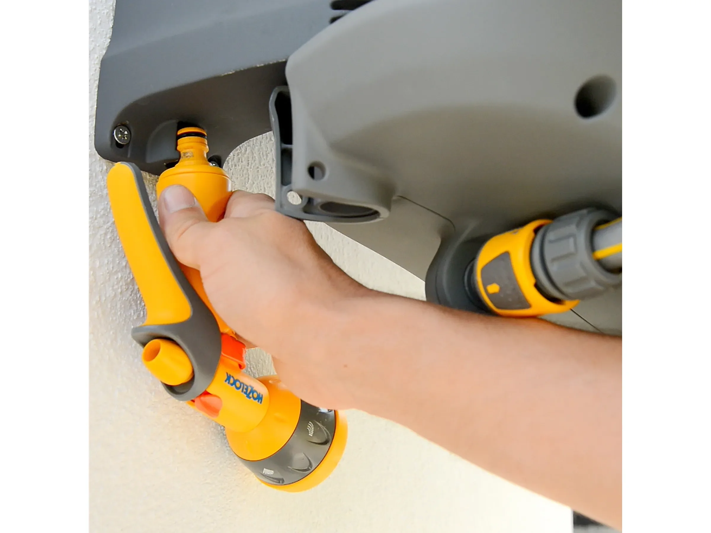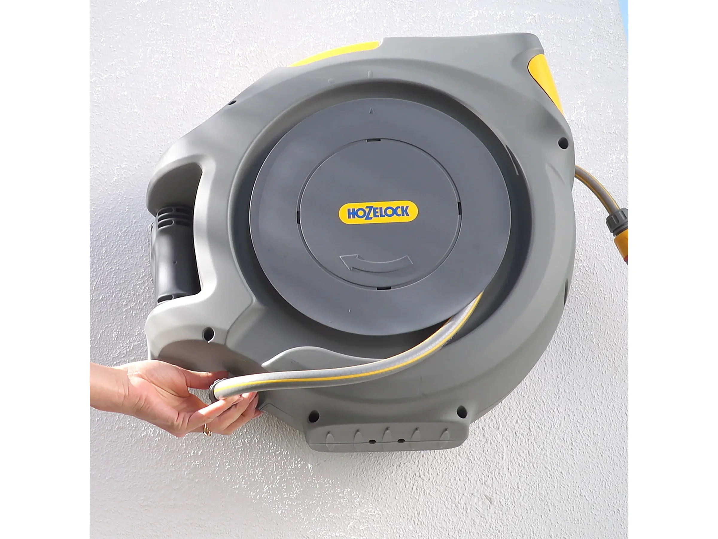 - Automatische Arretierung: Die Schlauchbox fixiert den Schlauch selbstständig, sodass er entspannt gehalten werden kann.