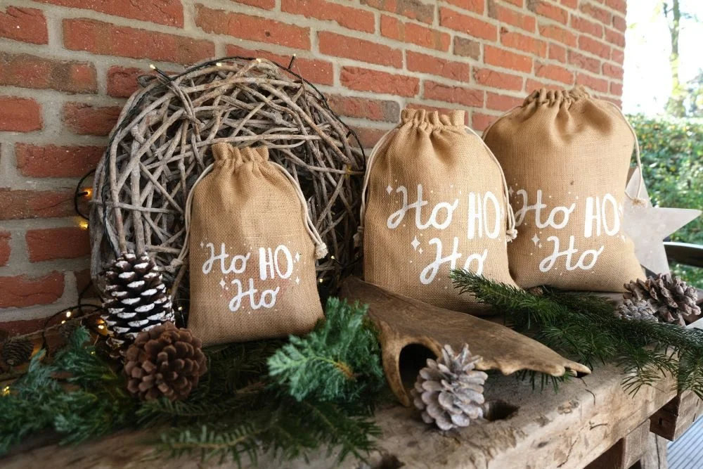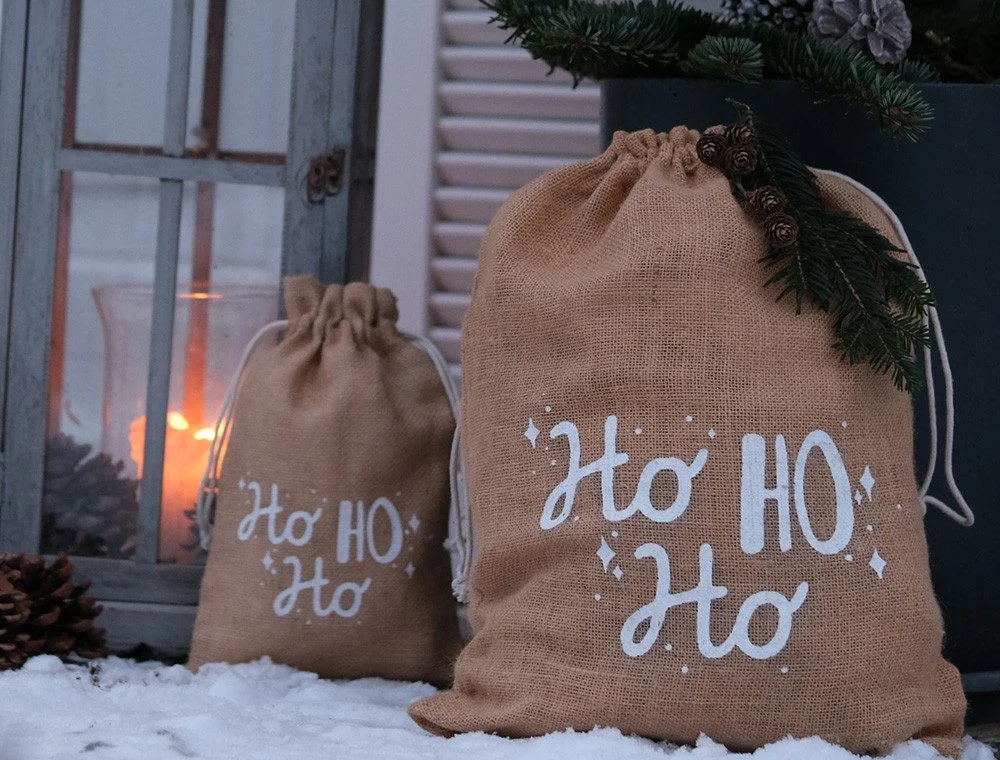 Jutebeutel „Ho Ho Ho“ – 2er-Set Geschenk- & Weihnachtssäckchen mit Kordel