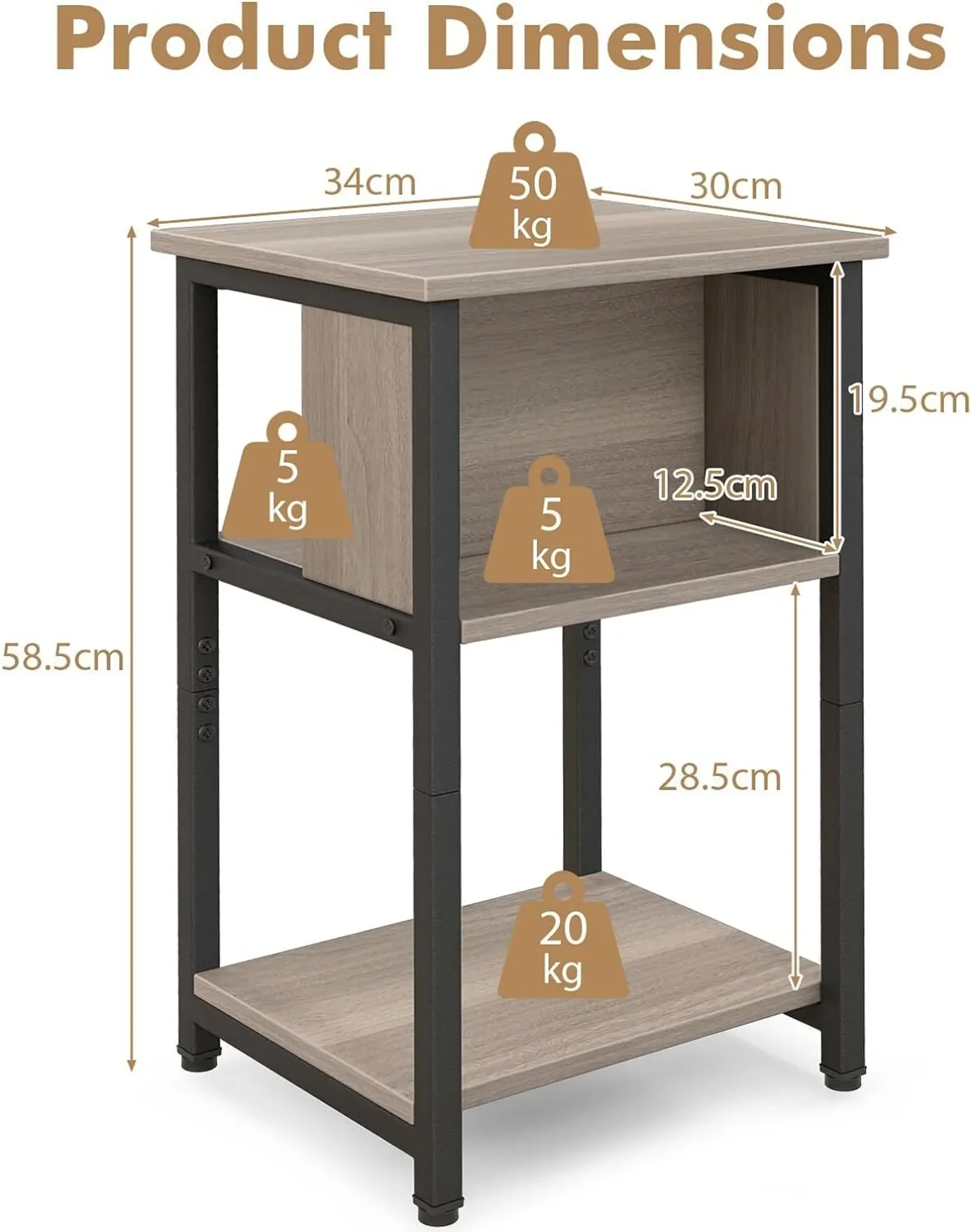 - Gesamtmaße: 34 × 30 × 58,5 cm (L × B × H)