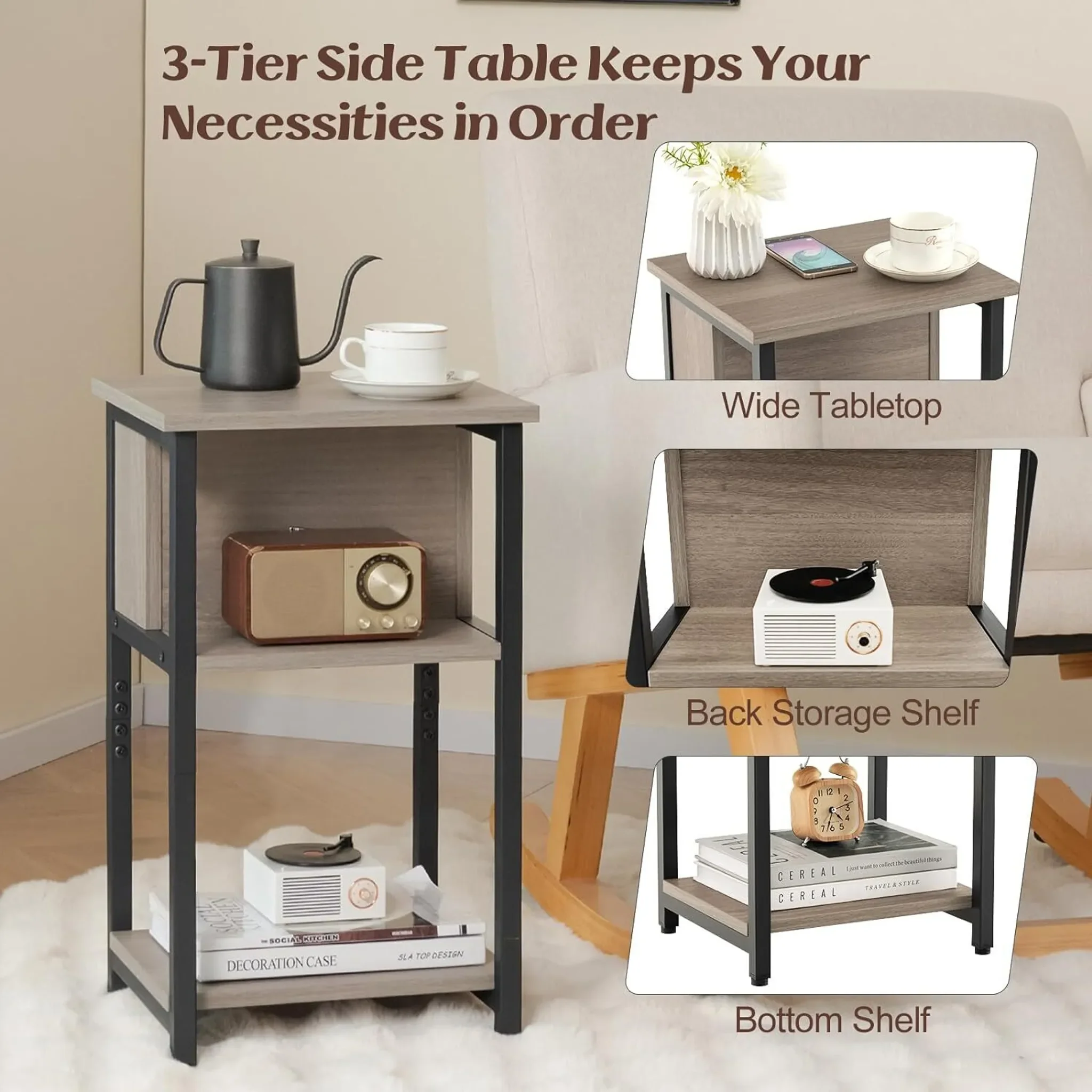 Produktinformationen "KOMFOTTEU 3-stufiger Nachttisch – Beistelltisch mit Ablage, 34 × 30 × 58,5 cm, Grau-Schwarz"