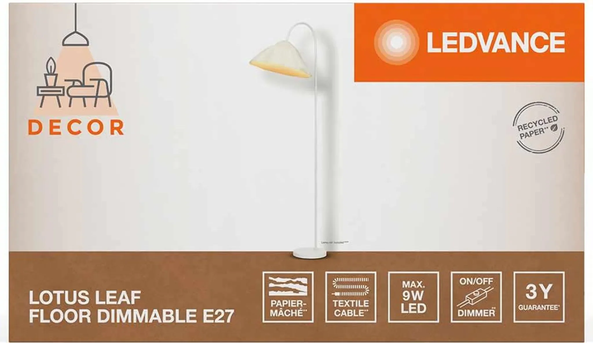 Die Ledvance Decor Lotus Leaf Stehleuchte kombiniert zeitloses Design mit nachhaltigen Materialien. Der Leuchtenschirm in eleganter Lotusblatt-Form wird aus recyceltem Pappmaché gefertigt und schafft ein einzigartiges, natürliches Ambiente in jedem Wohnraum. Mit ihrer weißen Oberfläche fügt sich die Leuchte harmonisch in moderne und klassische Einrichtungsstile ein.
