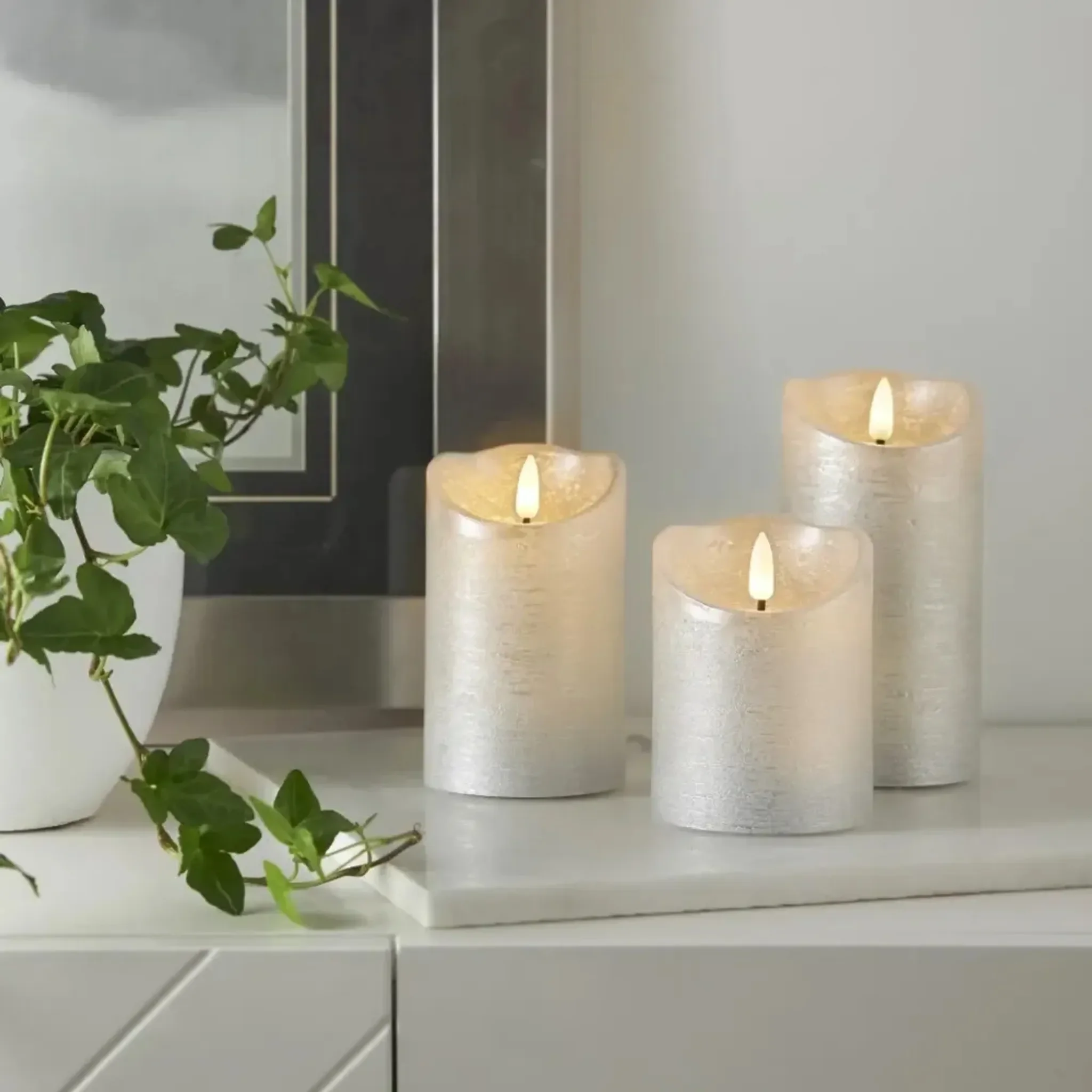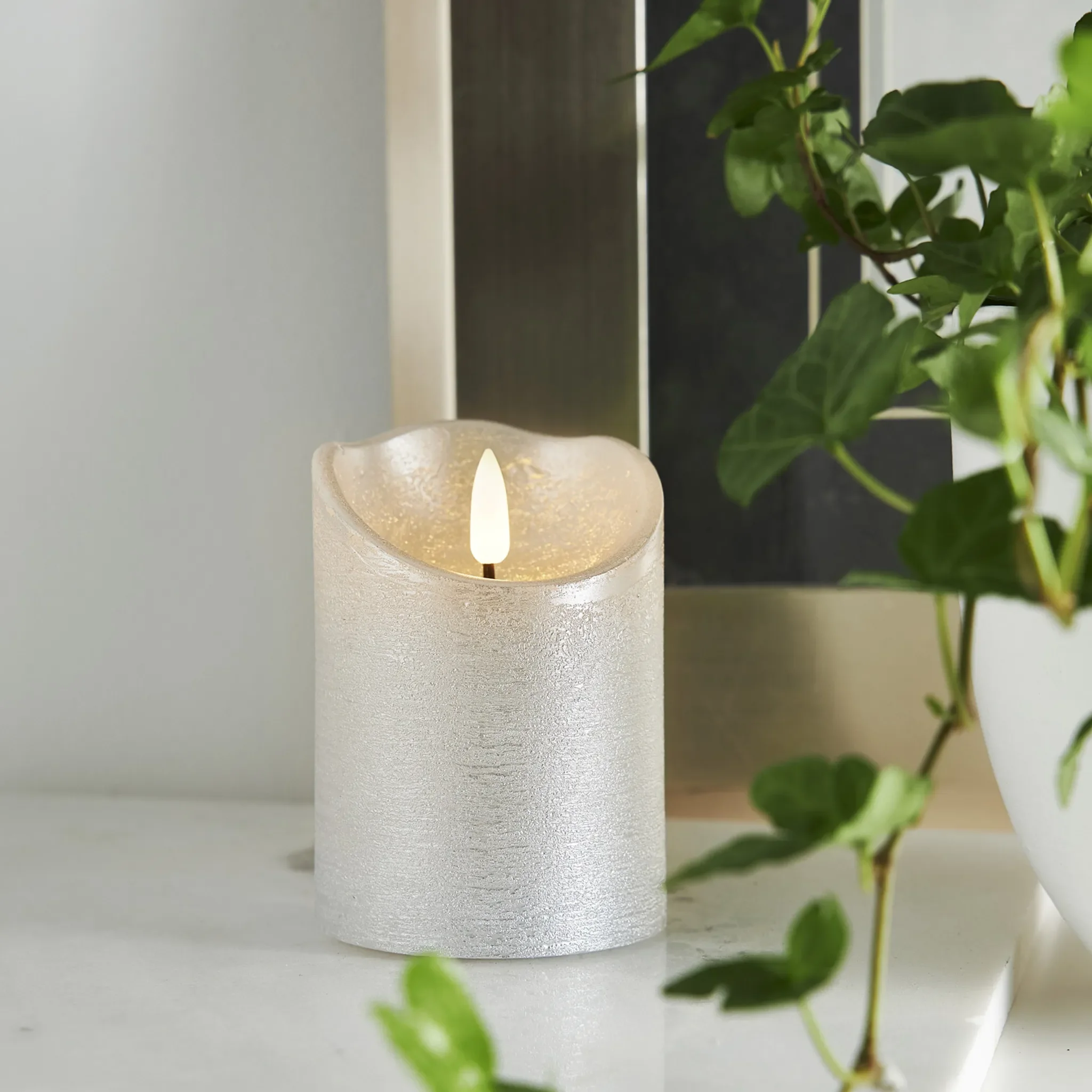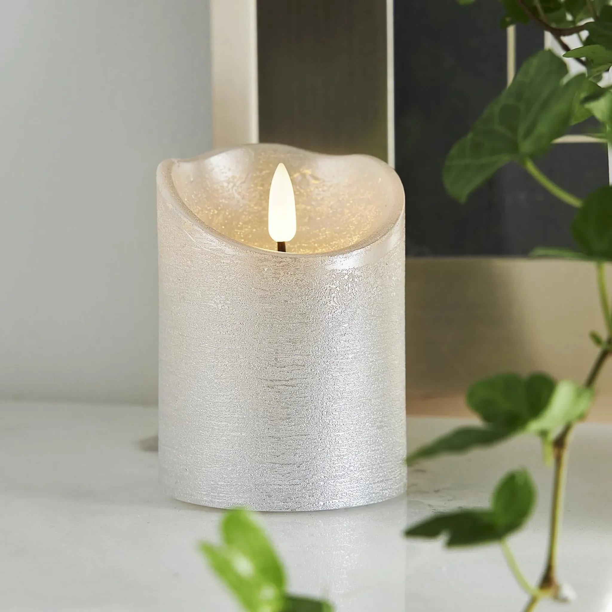 Rustikale LED-Stumpenkerze aus Echtwachs mit naturgetreuer 3D-Flamme und Timer – elegante Dekoration in Silber
