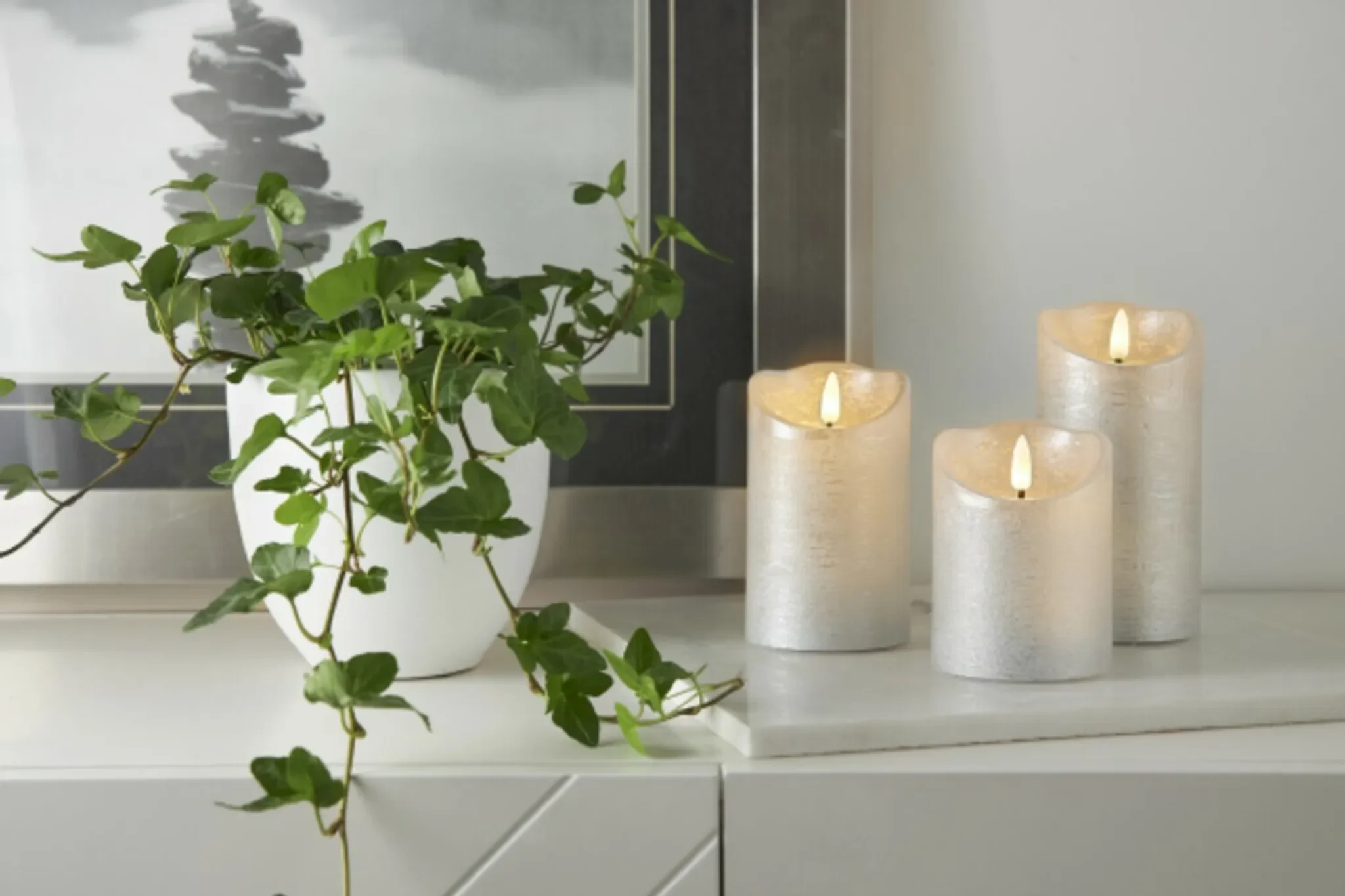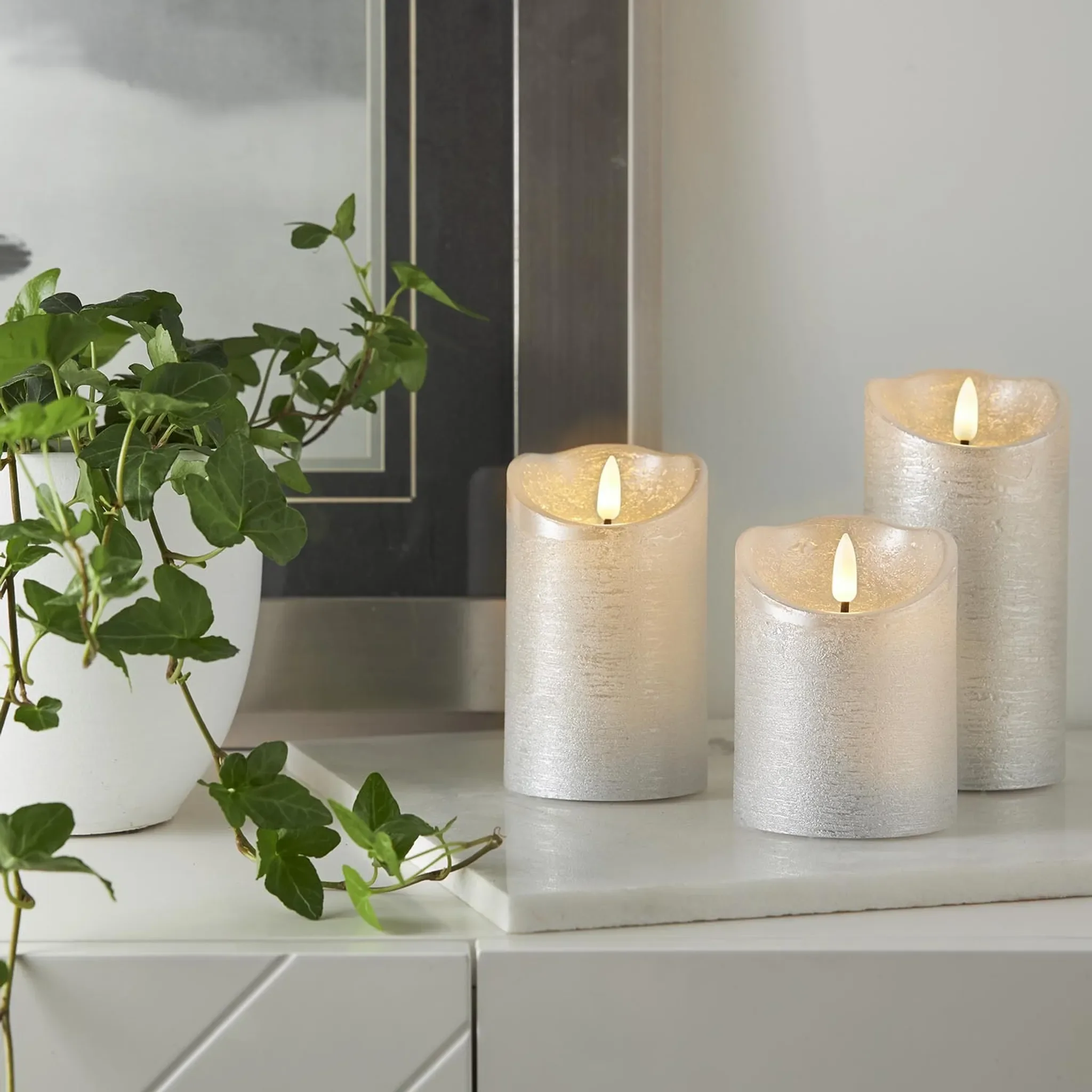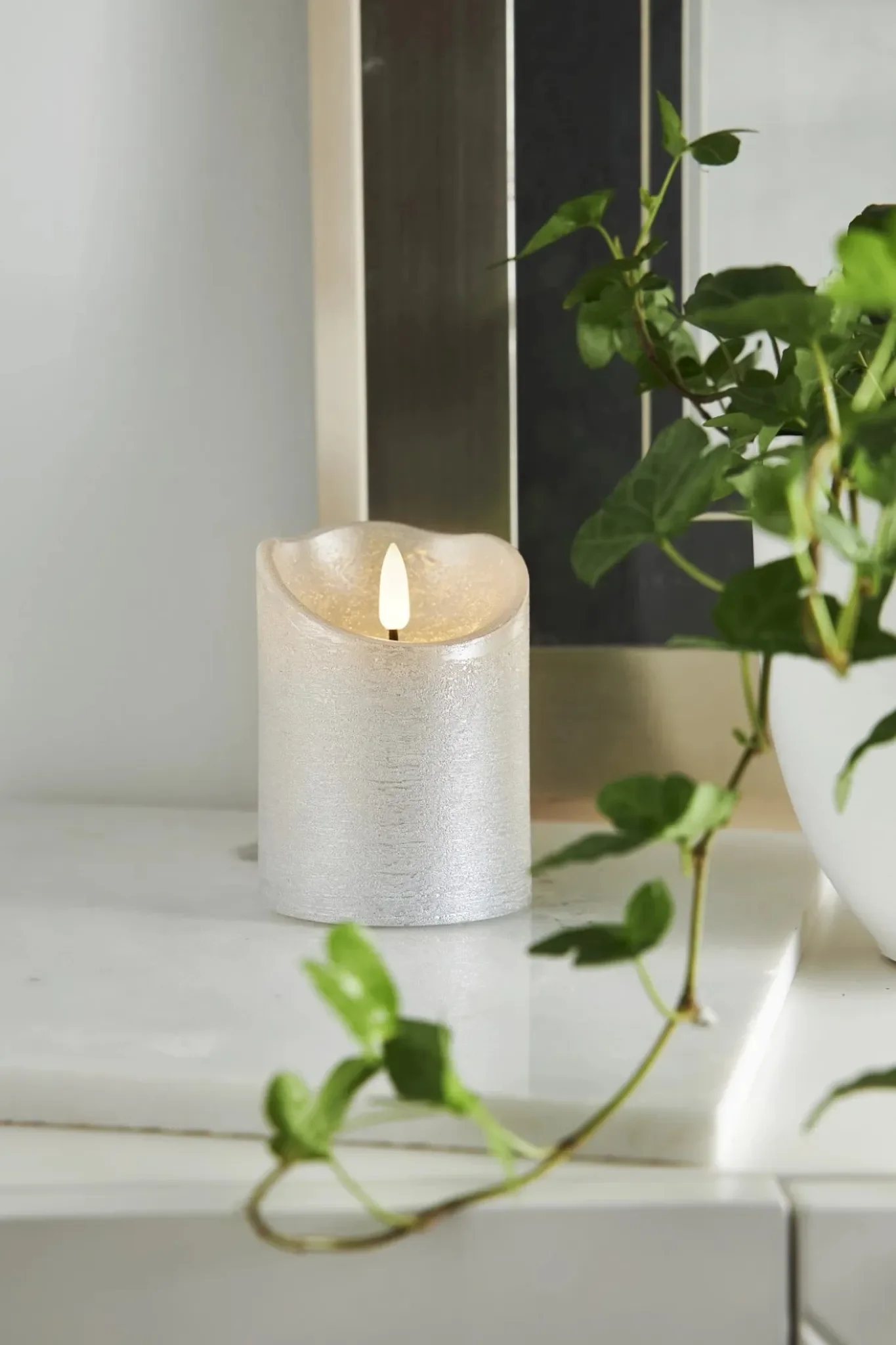 Rustikale LED-Stumpenkerze aus Echtwachs mit naturgetreuer 3D-Flamme und Timer – elegante Dekoration in Silber
