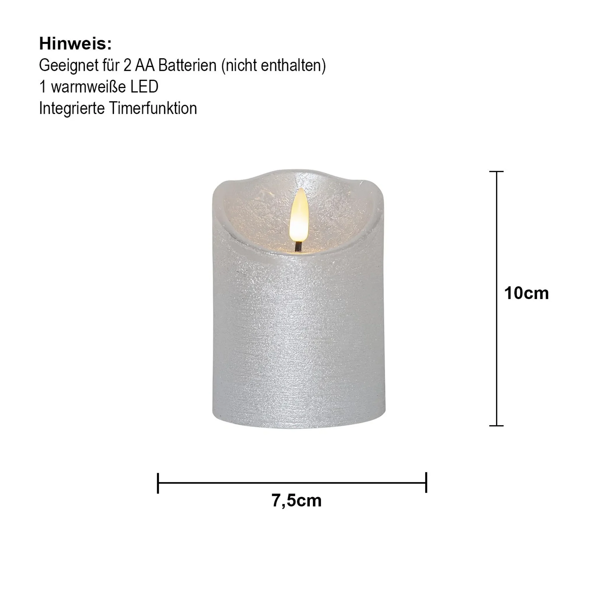 | Lieferumfang | 1 × LED-Echtwachs-Kerze „Flamme Rustic“ Silber (ohne Batterien) |