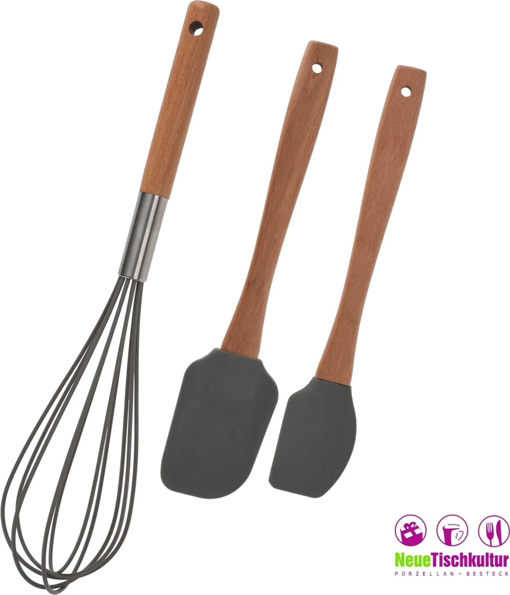 Modernes 3-teiliges Küchenhelfer-Set aus Holz und Silikon – bestehend aus Schneebesen und zwei Teigwendern in Grautönen